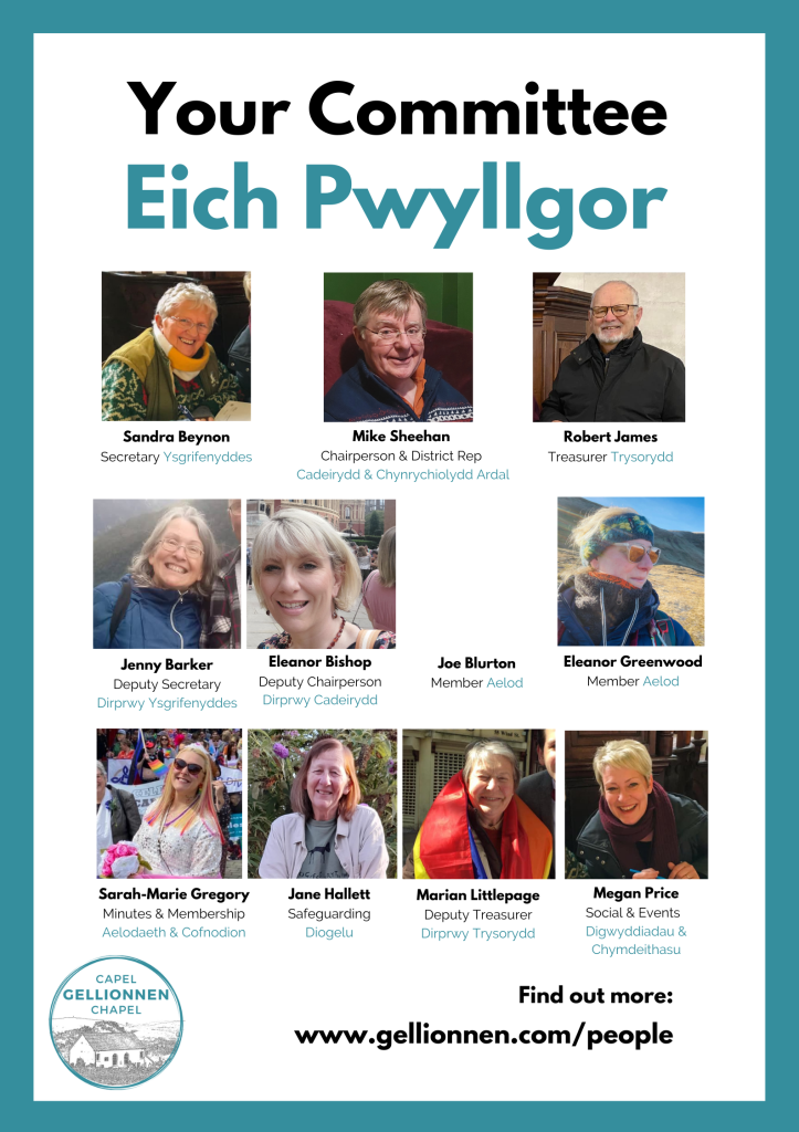Rydym yn cynnal Cyfarfod Cyffredinol Blynyddol bob gwanwyn, lle’r ydym yn ethol pwyllgor i arwain y capel ar gyfer y 12 mis nesaf. Dyma aelodau presennol ein pwyllgor: